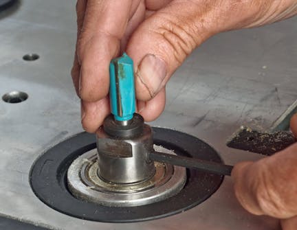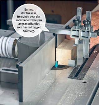 Fræsejernet monteres i den justerbare spindel, som kan benytte fræsejern med et skaft på 6-8 eller 12 mm.