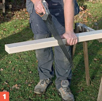 Sav alle dele til rammer og ben ud, mal dem, og lad dem tørre et døgn. Du kan godt skære dem ud med en fukssvans, men det er hurtigere og mere præcist med en kapsav.