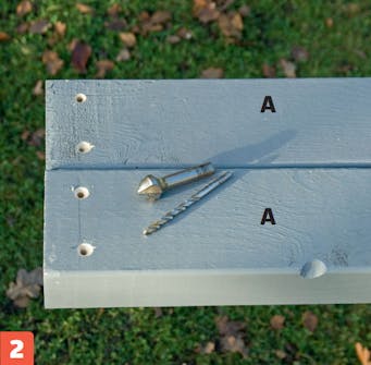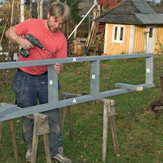 Saml de to identiske rammer bestående af rammesiderne (A) og tværstykkerne (B). Vi bruger to 5 x 100 mm skruer i hver samling.