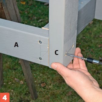 Skru benene (C) fast til den ene ramme via rammesiderne (A). For at få en flot finish har vi streget op, så skruerne kommer til at sidde lige over for hinanden.