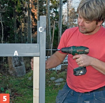 Mærk op til tværstykkerne (B) og benene (C) på rammesiderne (A). Bor for, og montér en forsænker på skruemaskinen, så skruerne bliver undersænket, når du samler rammen.
