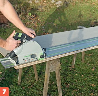 Sav bordpladen (D) og hylden (E) ud med en rundsav eller dyksav. Vi skærer spånpladens fer af i siden, men bevarer den for enden af bordpladen, da den kun skal samles i længden.