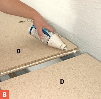 Læg de to plader, som udgør bordpladen (D), på plads på skelettet, og giv samlingen en god klat trælim, inden du trykker dem sammen.
