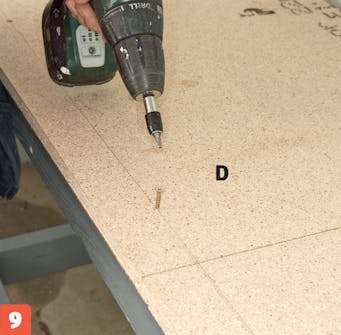 Gør bordpladen (D) og hylden (E) fast på hver sin ramme. Hylden passer til rammen, mens bordpladen rager 2 cm ud over siderne og forkanten. Pladerne skrues fast til skelettet med 4 x 55 mm skruer.
