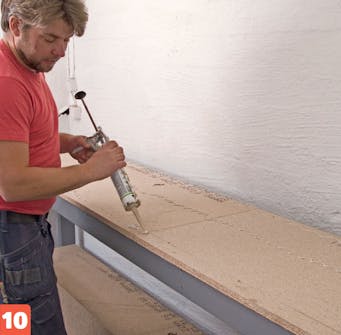 Giv bordpladen og hylden 3-4 striber montagelim. Limen gør, at masonitpladerne, som skal monteres oven på, ikke kommer til at “klapre”, når der hamres og bankes.