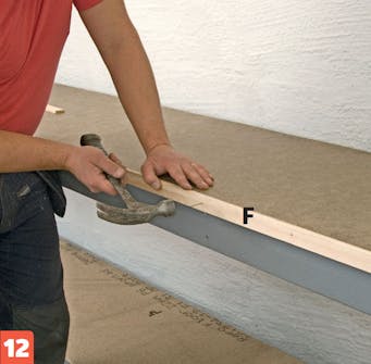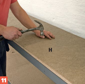 Tryk de tilskårne masonitplader (H) fast, så de dækker hele bordpladen. Gør dem fast med små dykkere, så de bliver trukket helt ned i bordpladen.