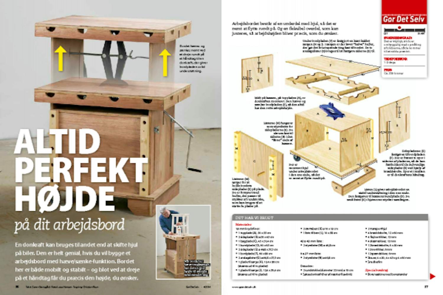 Arbejdsbordet består af flere dele - en fast underdel, der samles som en kasse, samt en løs overdel, der fungerer som bordplade og kan køres op og ned. Mellem de to dele - på toppen af kassen - fastgøres en billig saksedonkraft, der gør det muligt at hæve og sænke bordet.