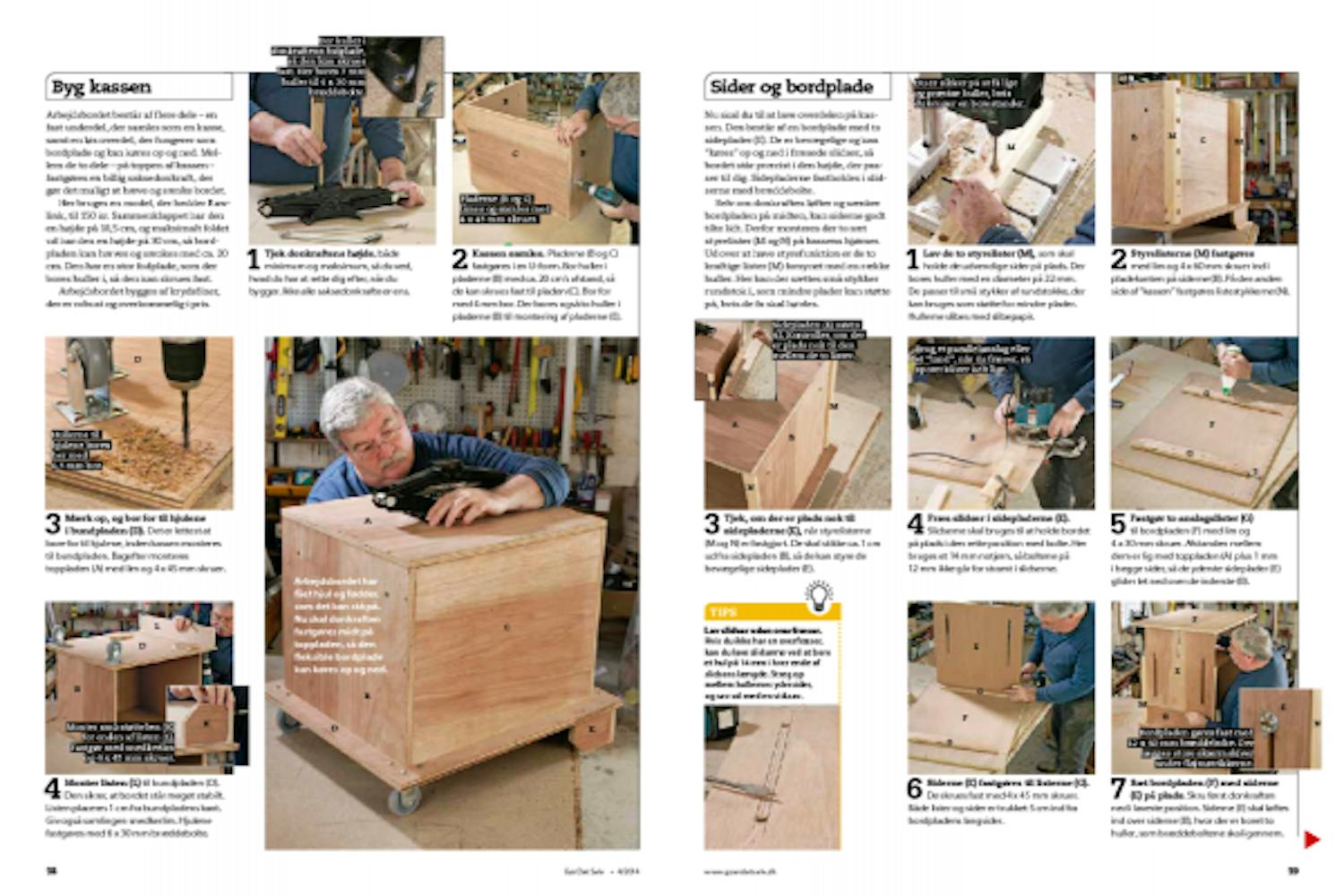 Mærk op, og bor for til hjulene i bundpladen (D). Det er lettest at bore for til hjulene, inden kassen monteres til bundpladen. Bagefter monteres toppladen (A) med lim og 4 x 45 mm skruer.