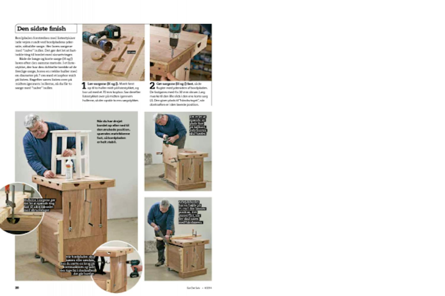 Nu skal du til at lave overdelen på kassen. Den består af en bordplade med to sideplader (E). De er bevægelige og kan “køres” op og ned i fræsede slidser, så bordet står præcist i den højde, der passer til dig. Sidepladerne fastholdes i slidserne med bræddebolte.