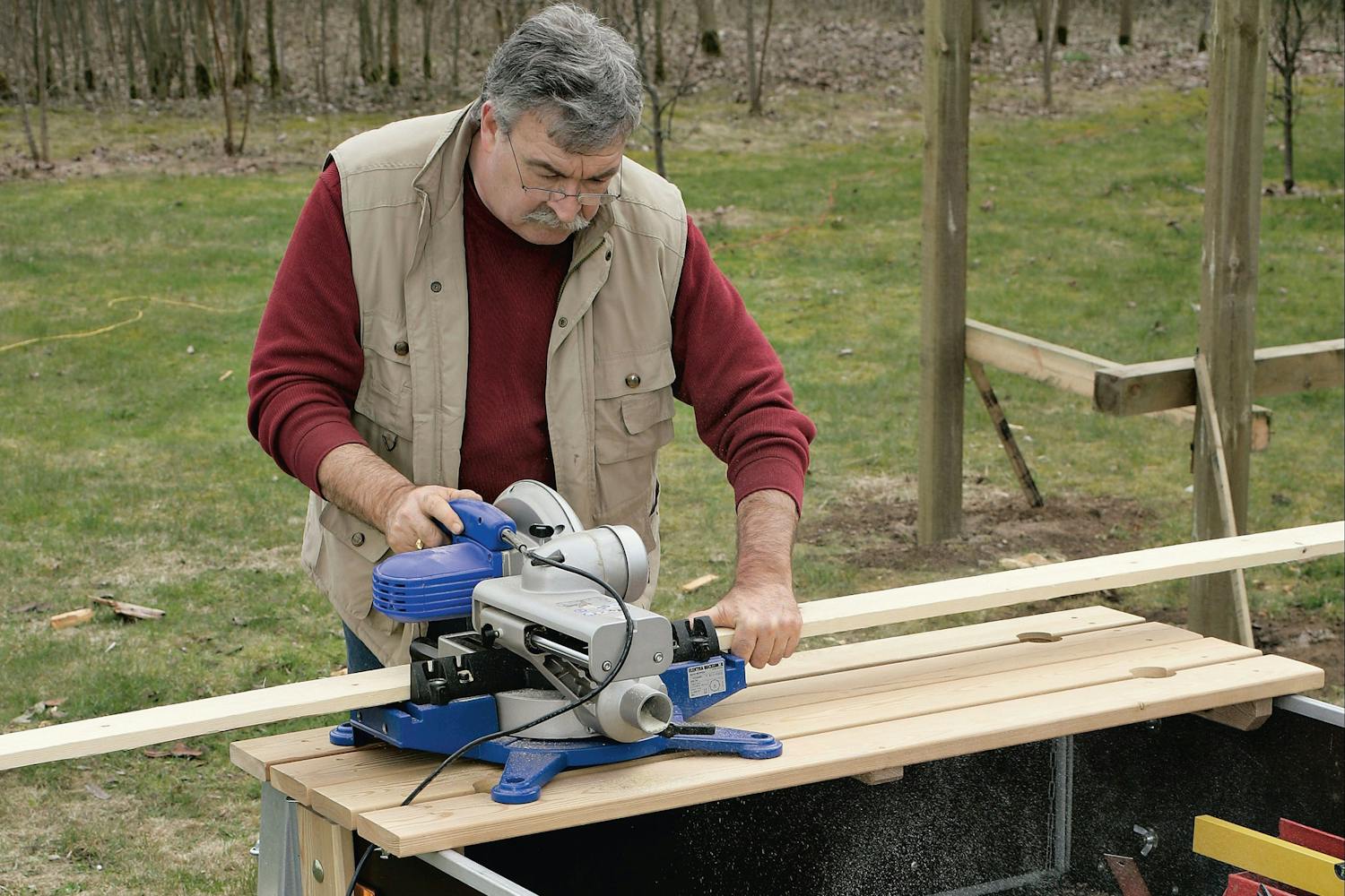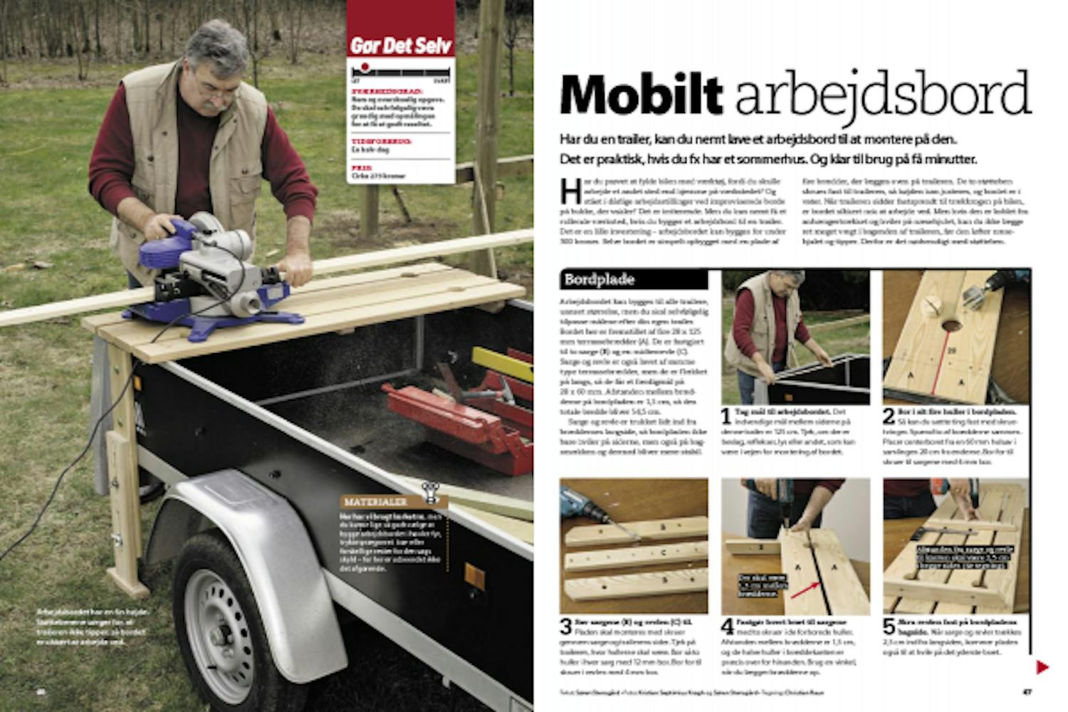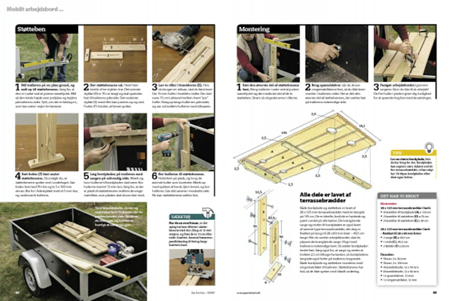 Arbejdsbordet kan bygges til alle trailere, uanset størrelse, men du skal selvfølgelig tilpasse målene efter din egen trailer. Bordet her er fremstillet af fire 28 x 125 mm terrassebrædder (A). De er fastgjort til to sarge (B) og en midterrevle (C). Sarge og revle er også lavet af samme type terrassebrædder, men de er flækket på langs, så de får et færdigmål på 28 x 60 mm. Afstanden mellem brædderne på bordpladen er 1,5 cm, så den totale bredde bliver 54,5 cm.