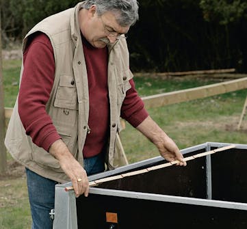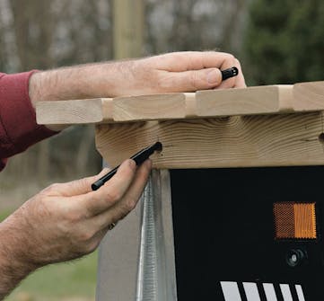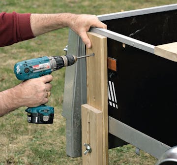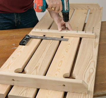 Fastgør hvert bræt til sargene med to skruer i de forborede huller. Afstanden mellem brædderne er 1,5 cm, og de halve huller i bræddekanten er præcis over for hinanden. Brug en vinkel, når du lægger brædderne op.