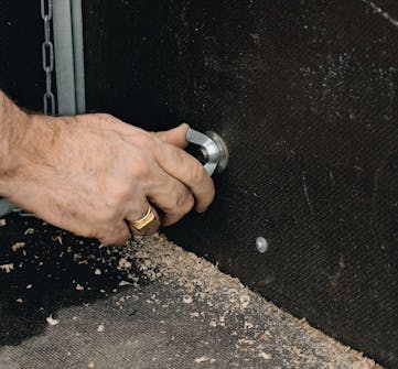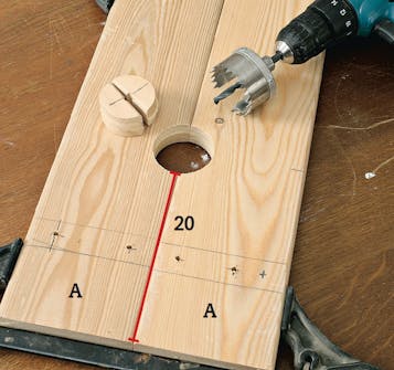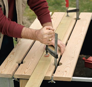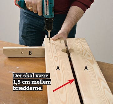 Bor i alt fire huller i bordpladen. Så kan du sætte ting fast med skruetvinger. Spænd to af brædderne sammen. Placer centerboret fra en 60 mm hulsav i samlingen 20 cm fra enderne. Bor for til skruer til sargene med 4 mm bor.