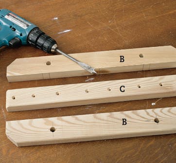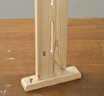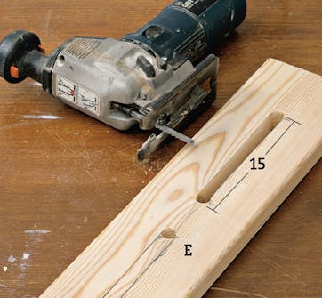 Lav to riller i brædderne (E). Hvis du bruger en stiksav, skal du først bore fire 13 mm huller i brættets midte. Der skal være 15 cm’s afstand mellem hvert “par” huller. Streg op langs hullernes ydersider, og sav ud mellem hullerne med stiksaven.