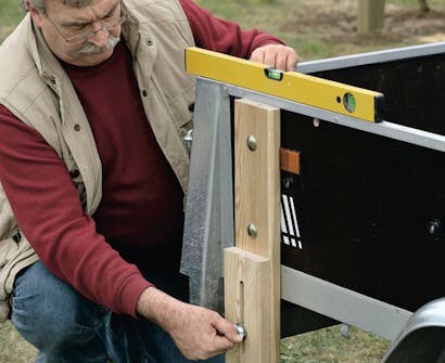 Brug spændskiver, når du skruer vingemøtrikkerne fast, så du ikke laver mærker i trailerens sider. Her er det den øverste del af støttebenene, der sættes fast på trailerens indvendige side.