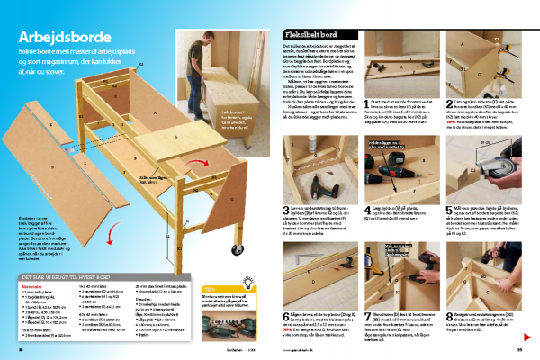 Målene, vi har opgivet i materialelisten, passer til det værksted, bordene nu står i. Du kan selvfølgelig gøre dine arbejdsborde både længere og bredere, hvis du har plads til det - og brug for det.