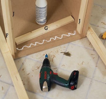 Lav en understøtning til bundhylden (B) af listerne (G) og (J), der placeres 12 mm lavere end brættet (F), så hylden kommer til at flugte med brættet. Lim og skru listerne fast med 4 x 30 mm skruer udefra.