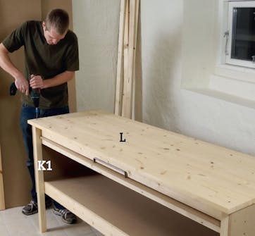 Skru bordpladen (L) fast til bordbenene (K1 og K2) med 6 x 120 mm skruer. Monter håndtag på lågen.