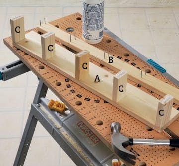 Sav listen (A) til, og lim og skru de to støtter (B) fast nedenunder med tre skruer (5 x 60 mm) i hver støtte.