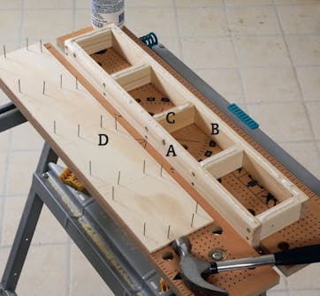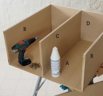 Skru og lim de to sider (B) og bunden (D) sammen og dernæst fast på forpladen (A). Bor for, og brug lange tynde skruer, så pladerne ikke flækker, når du skruer dem i.