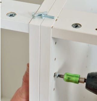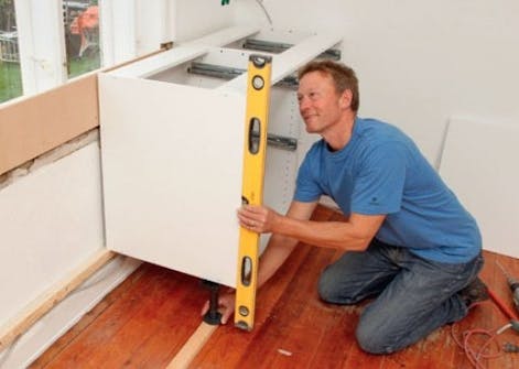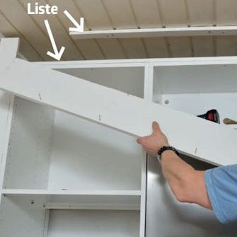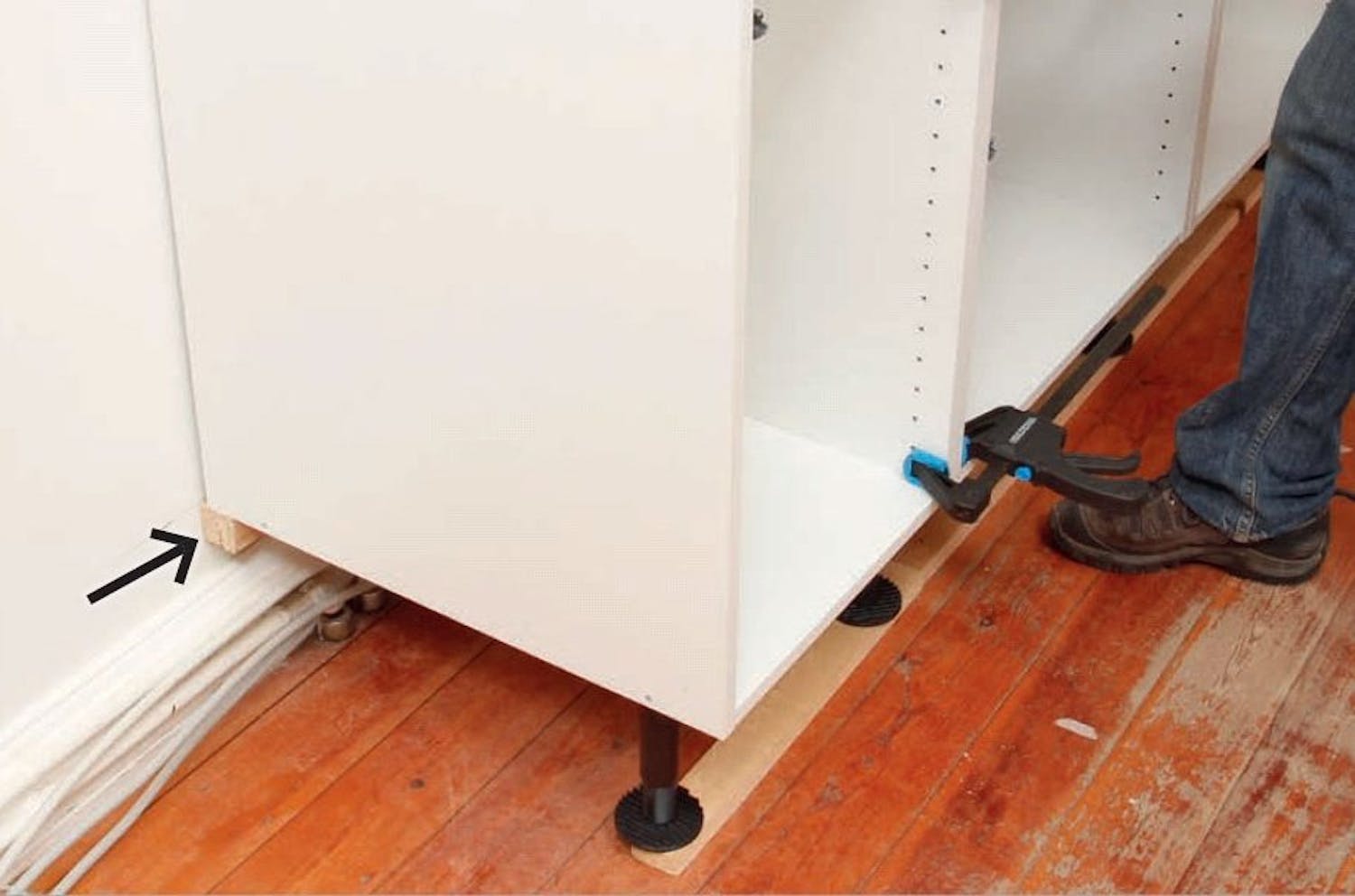 Byg et simpelt stillads bestående af en plade og fire ben. Benene skal have en længde, så overskabene kommer til at sidde i den rigtige højde med skabene oven på stilladset. Når skabene er placeret på stilladset, rykker du det forsigtigt på plads op mod væggen og samler skabene med samleskruer.