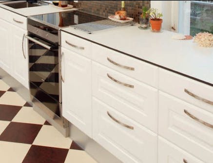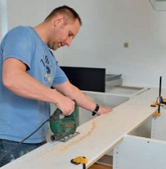 Bordpladerne lægges op på underskabene, så du kan danne dig et overblik over, hvor den rundede forkant skal fjernes. Mærk op, hvor meget der skal fjernes, så du kan få en tæt samling.
