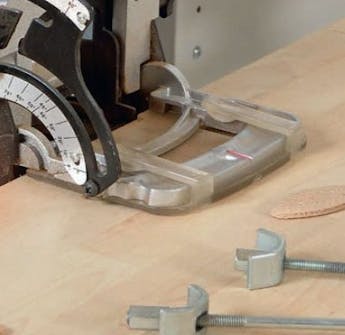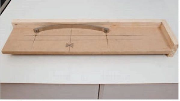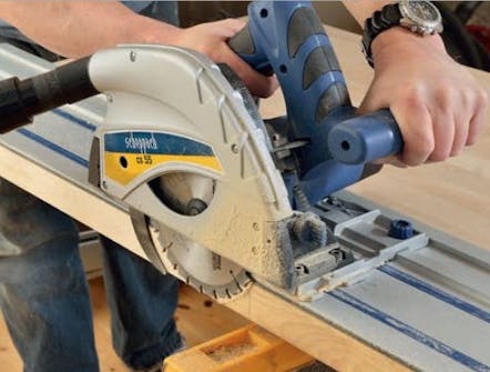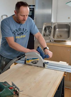 Sav bordpladen til med en rundsav med føringsskinne. Det sidste stykke af den rundede kant fjernes med fukssvans og stemmejern, så du får et knivskarpt hak, hvor den tilstødende plade passer ind.