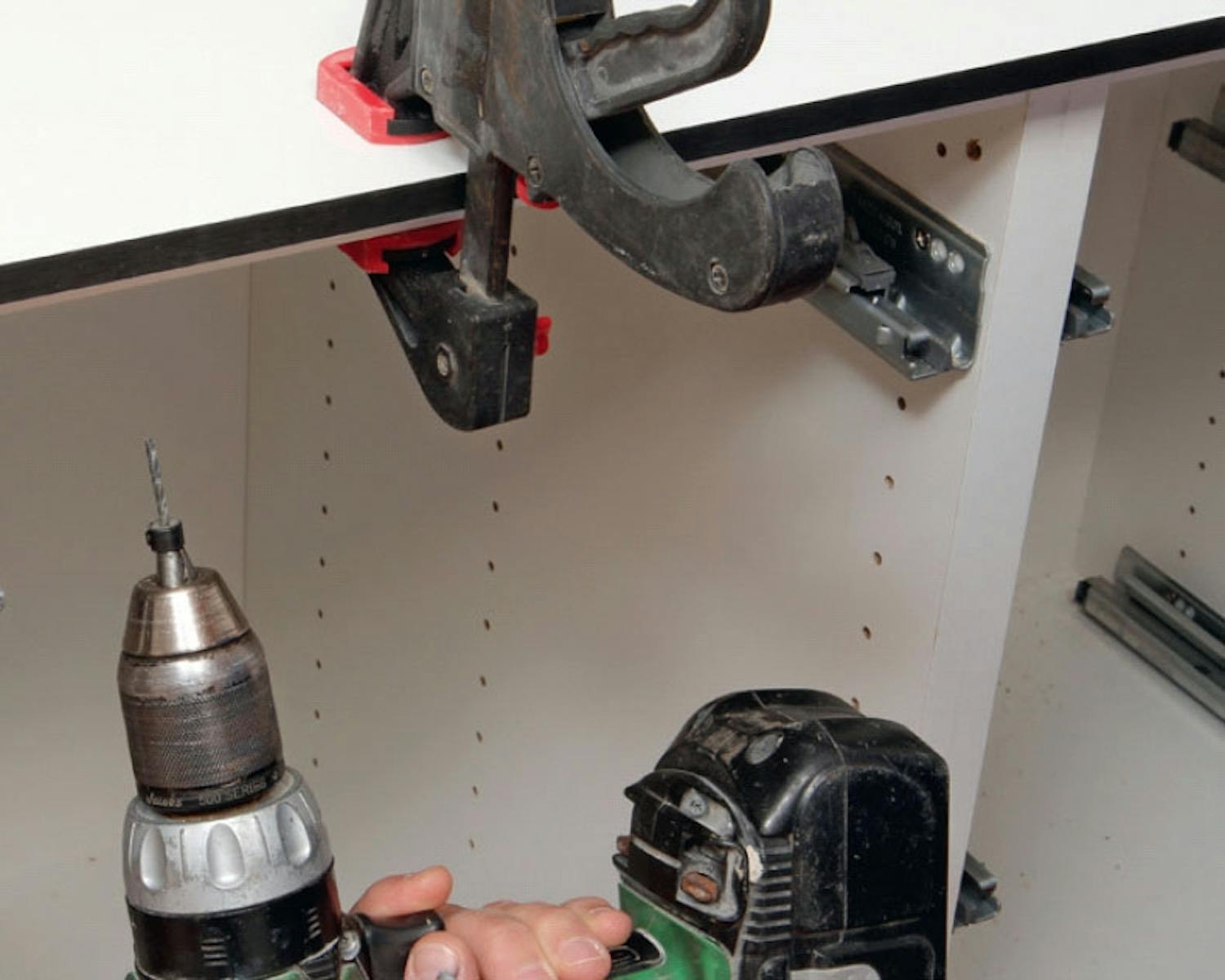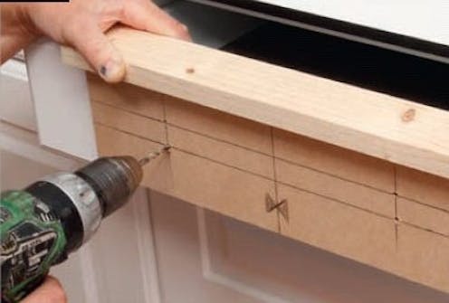 Byg en skabelon af et stykke vinkelret træplade med lister på to af siderne. Mål op, hvor grebet skal placeres for at sidde midt på lågen/ skuffen, og hvor langt fra overkanten det skal sidde. Bor så huller i skabelonen, der svarer til det.
