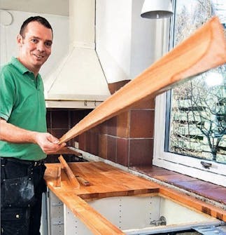 Montér listen, når du har smurt rigeligt med silikone på sider ne mod bord og væg. Skurelisten fikseres midlertidigt med lange lister og tvinger, indtil silikonen er tør. Får du brug for at lave en samling midt på skurelisten, bør du lave et skråt snit i stedet for et vinkelret - det bliver nemlig mindre tydeligt, når træet med tiden trækker sig lidt sammen.