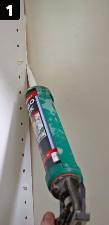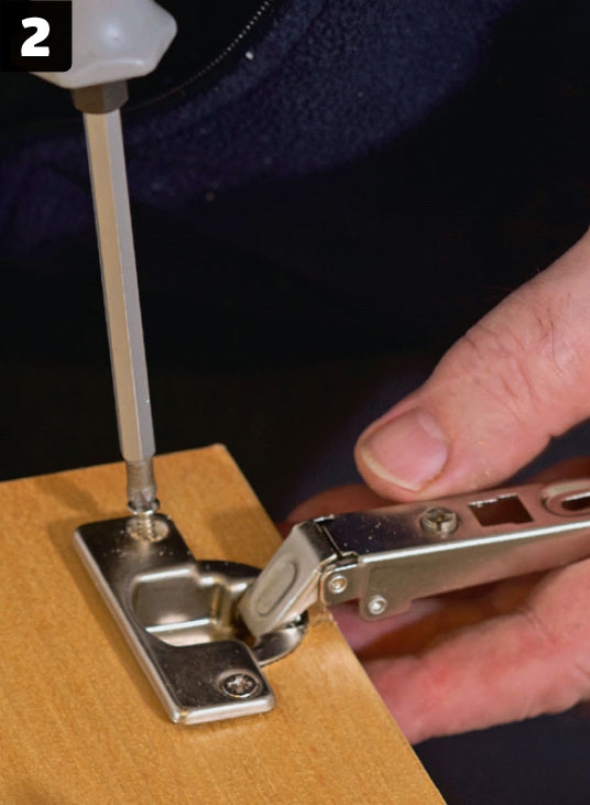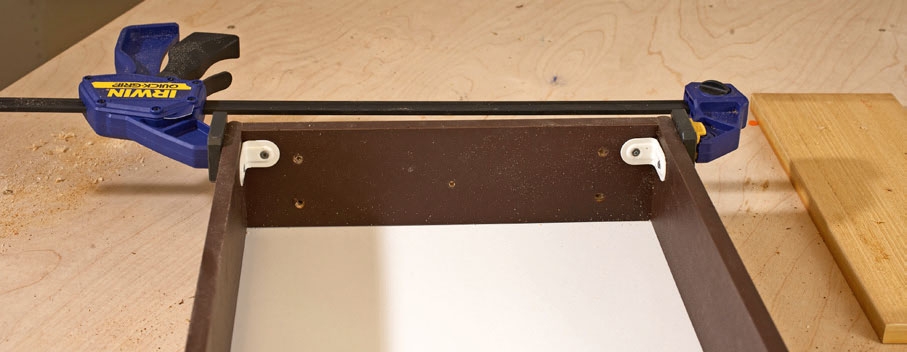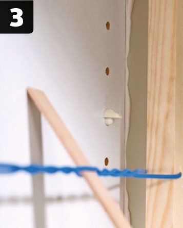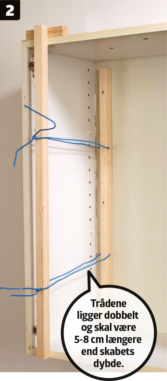 Bor to huller i en liste, og stik et par lange tråde, eksempelvis tørresnor, igennem. Skru listen fast til bagbeklædningen, UDEN at den får direkte kontakt med limen. Skruerne skal have godt fat i bagbeklædningen, så sørg for at bruge nogle, der er store nok, fx 4 x 35 mm. Som modhold bruges endnu en liste, der dog skæres, så den hviler på skabets over- og underkant.