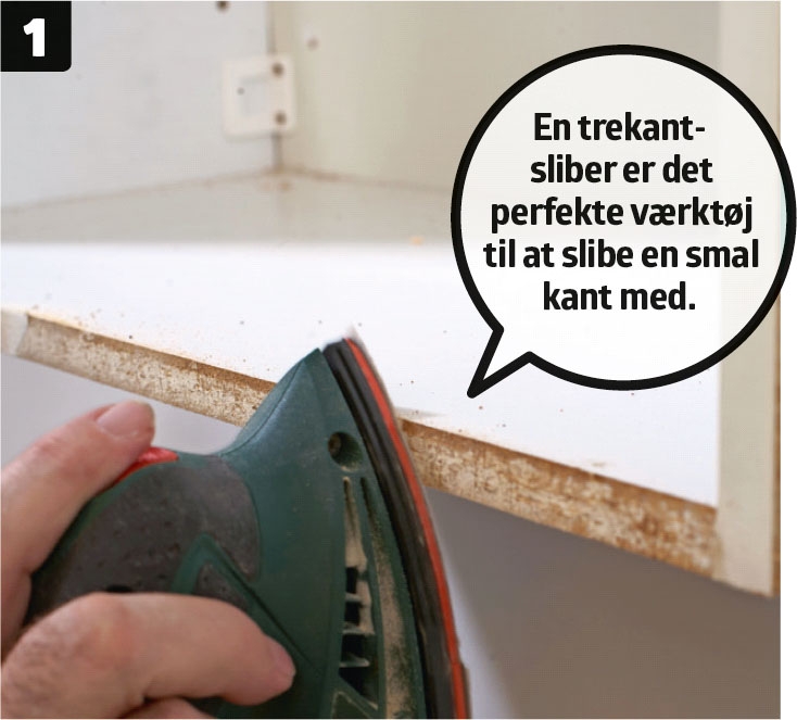 Skabets kant skal være ren og plan. Snavs afrenses, og limrester efter den gamle kantliste slibes af med fint slibepapir.