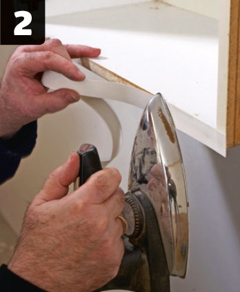 Kantlistens bagside hæfter, når listen opvarmes med strygejernet. Brug medium varme, og pres kantlisten mod kanten. Når kantlisten igen er afkølet, er limen hærdet.