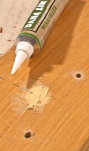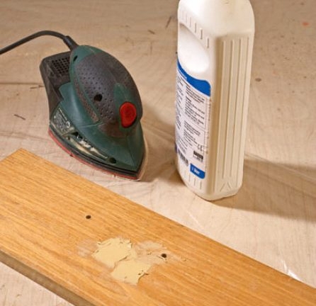 Lap det gamle hul med træspartelmasse. I dette eksempel brugte vi farven “bøg”. Slib reparationen let med slibepapir korn 180.