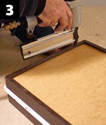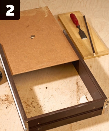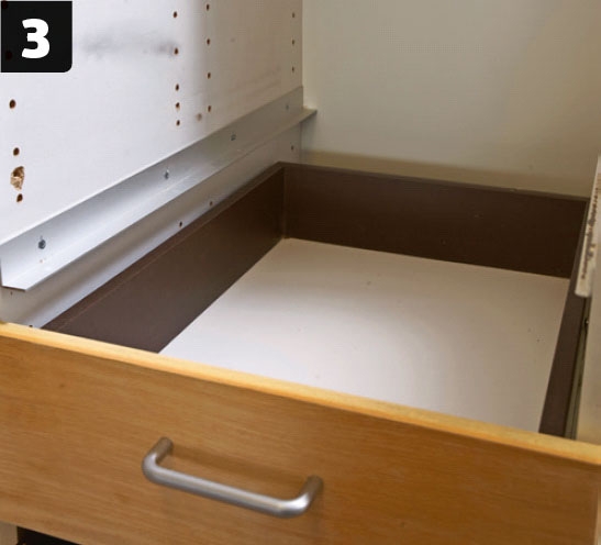 Den gamle skuffebund kan nu trækkes ud af skuffen. Byggemarkedet har masonitplader med en melaminbehandlet hvid side. Køb en ny plade, og overfør målet fra det gamle stykke. Husk, det nye bundstykke skal være ca. 6 mm længere i bagkanten. Sav pladen ud, og pres den ind i rillerne.