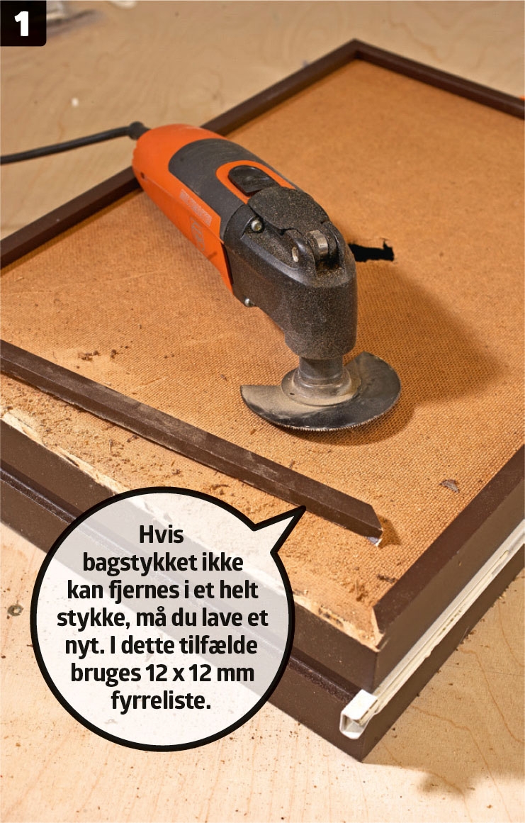 Skuffebunden er fastgjort i en rille. Bunden frigøres ved at skære det nederste stykke af bagstykket af med en multicutter. Det frigjorte listestykke skal gemmes til senere brug.