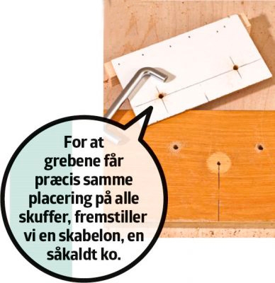 Afmontér skuffefronten, fjern det gamle greb, og bor hullerne til det nye. Skifter du alle greb i køkkenet, råder vi dig til at lave en skabelon, du kan bore efter. Så er du sikker på, at de alle placeres fuldstændig ens.