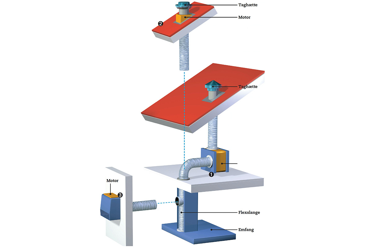 Jo længere der er fra emfang til motor og fra motor til taghætte, desto længere flexslange skal du bruge. Og på grund af flexslangens indvendige riller bliver luften bremset mere, jo længere den skal transporteres. Du bruger derfor mere strøm, fordi du skal skrue mere op for udsugningen for at få madosen ud.