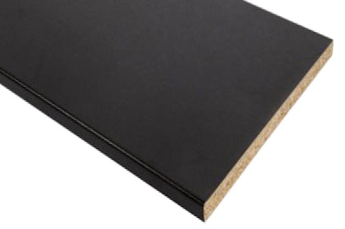 En ny bordplade i sort laminat er nødvendig, fordi kogepladen skal flyttes for at få en optimal placering tæt på udsuget til emhætte. Så vi bruger dele af bordpladen fra genbrugskøkkenet og supplerer med en ny magen til den gamle. Havde vi brugt bordpladen fra genbrugskøkkenet, som den er, ville kogepladen have været delvist ud for vinduet, og det dur ikke.
