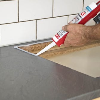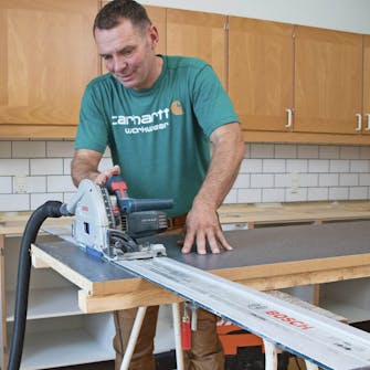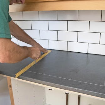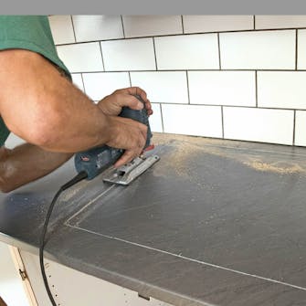 Sav bordpladen til i længden, når du har målt afstanden over køkkenskabene op. Brug gerne en rundsav med styreskinne med en klinge beregnet til laminat. Rids først et spor med en dybde på 3 mm, og sav så igennem hele pladen. Så undgår du, at kanten flosser.