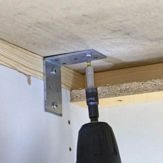 Bordpladen fastgøres til køkkenelementerne med vinkeljern. Sørg for, at skruerne har en passende længde, så du ikke skruer igennem bordplade og køkkenskabe.