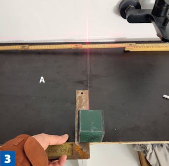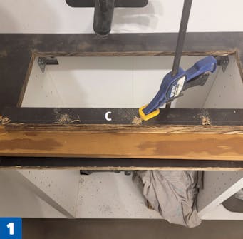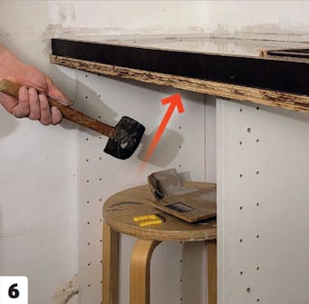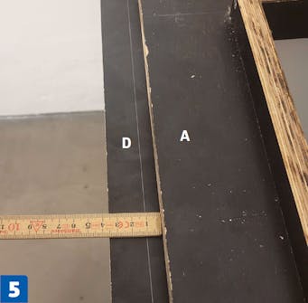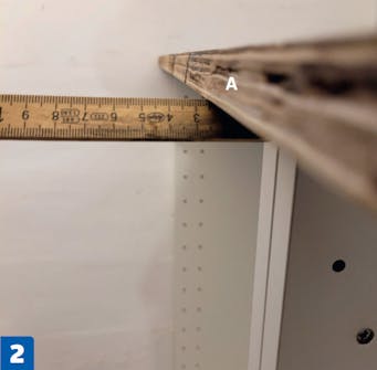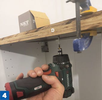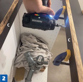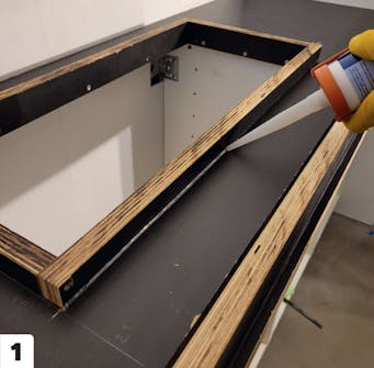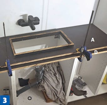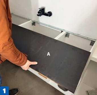 Først skal du lave en bundplade i 18 mm støbekrydsfiner, som lægges på toppen af standard-skabselementer. Du skal derefter justere bundpladen ind, så forkanten ligger parallelt med skabselementerne, og så spænde den midlertidigt fast.