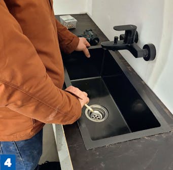 Til sidst skal håndvasken monteres. Start med at tape bordpladen af omkring vasken. Vend vasken på hovedet, og smør en tyk streg silikone på den vandrette flade. Læg så vasken i hullet.