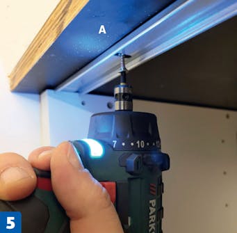 Spænd bundpladen (A) godt fast til skabselementerne. Brug alle skruehuller, men sørg for, at der ikke sidder skruer i den del af bundpladen, der stikker ud over skabene.