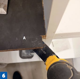 Justér bundpladen (A) ind efter skabene. Læg pladen så tæt på væggene, som den kan komme, og justér den så ind, så forkanten ligger parallelt med forsiden af skabene. Spænd bundpladen løst fast.