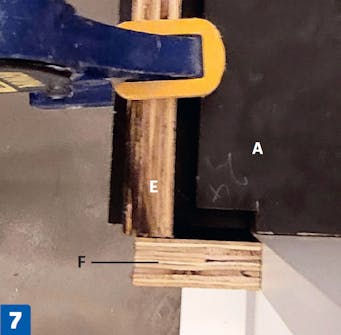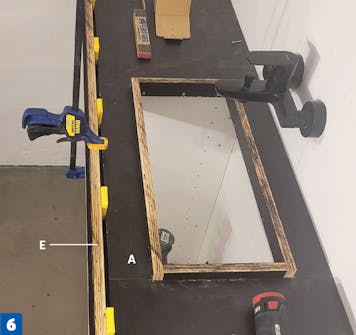 Montér den stående forkant (E). Den skal monteres, så den flugter med den streg, du lige har tegnet, så der opstår en rende på 1 cm mellem den stående forkant (E) og bundpladen (A). Det er vigtigt for det endelige resultat, at renden er helt lige, og derfor kan det også godt betale sig at bruge 1 cm afstandsklodser, når du placerer den stående forkant.