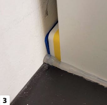 Brug rigelig silikone, når det er nødvendigt. Hvis der som her er huller, fx bag et skabselement, så skal det lukkes af, før du støber. Brug fx plastik- eller træklodser og rigelig silikone, så spartelmassen ikke løber.