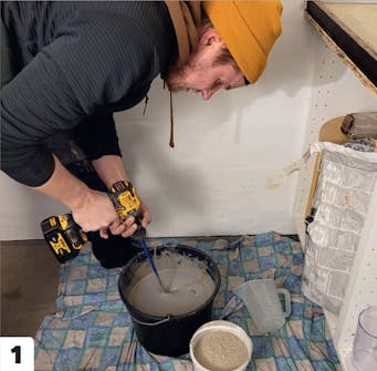 Bland spartelmassen grundigt. Følg anvisningerne på produktet. Her bruger vi grå Lip 220, som kan virke meget flydende. Bland en mængde, der passer til et lag på 12 mm, og stol på opskriften.