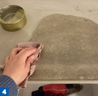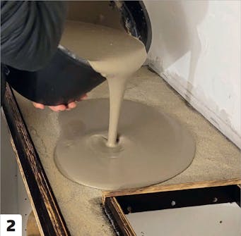 Når du støber bordpladen, skal du bruge en passende mængde selvnivellerende spartelmasse, som armeres med glasfibervæv. Massen skal blandes op som anvist og hældes forsigtigt i formen flere forskellige steder, så den har let ved at flyde jævnt ud.