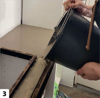 Hæld halvdelen af spartelmassen i formen. Vi har lavet en stiplet linje på væggen 6 mm over bundpladen til at styre efter, så vi kan stoppe i tide. Den endelige tykkelse skal være 12 mm.