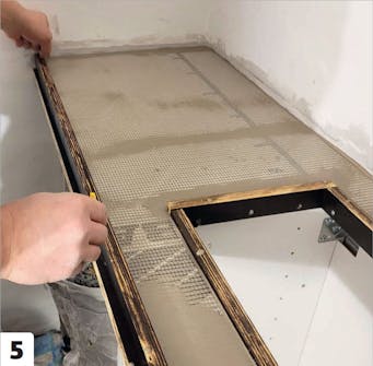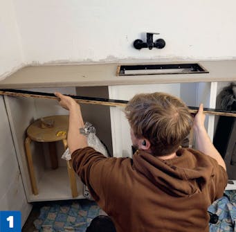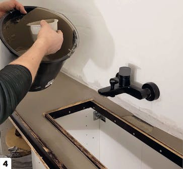 Støbeformen afgrænses her af vægge og skabselementer på tre sider. Langs forkanten og langs hullet til vasken skal du montere barrierer, så spartelmassen bliver på bundpladen.