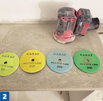 Slib bordet. Bordpladen er vandret, men ikke helt glat. Derfor skal du slibe overfladen med diamantslibeskiver på en excentersliber. Her bruger vi korn 50, 200, 400 og 800.